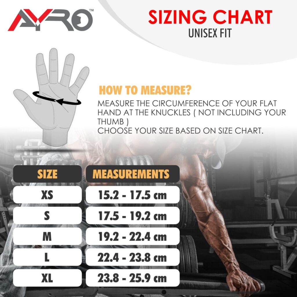 Ensure a perfect fit with AYRO Fit Nutrition’s comprehensive sizing chart for our unisex weight lifting gloves. To determine your size, measure the circumference of your flat hand at the knuckles, excluding your thumb. Refer to the chart to select the size that matches your measurement. With sizes ranging from XS to XL, our gloves are designed to provide a snug and comfortable fit for everyone. Choose the right size to maximize your comfort and performance during your workouts.
